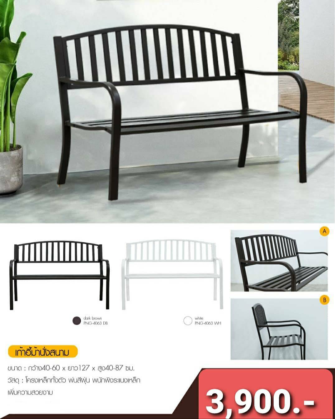 ม้านั่งสนาม ผลิตจากเหล็กดัดสีขาว และดำ อบสีด้วย Powder coating ลวดลายสวยงาม